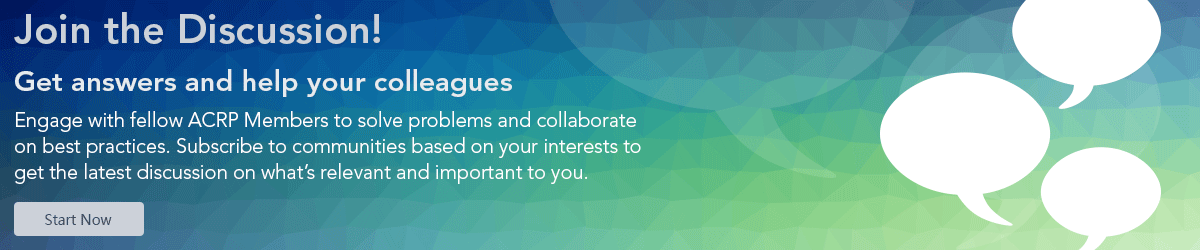 Your go-to place to connect and collaborate with thousands of ACRP members. Get in touch with colleagues and share best practices, get answers to challenging questions, and network with like-minded professionals. Open to ACRP members only.