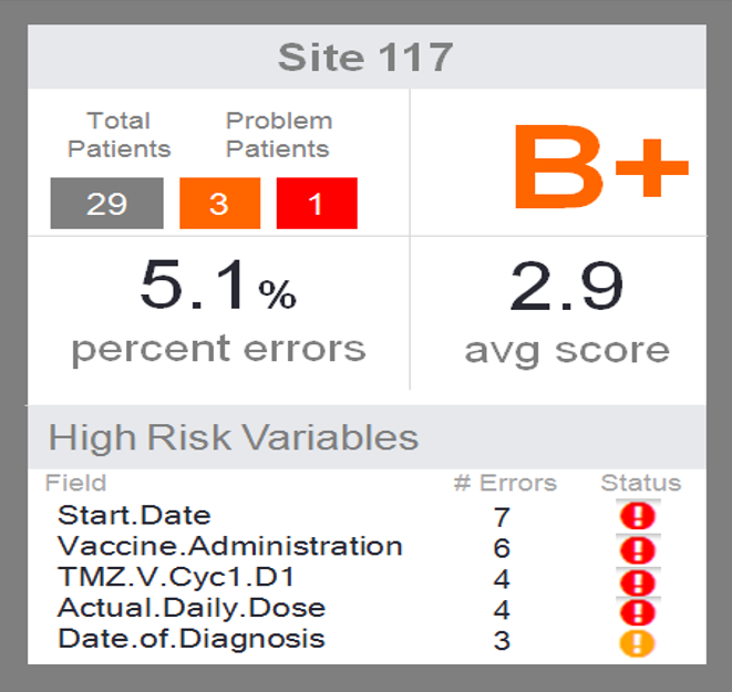 This underscores the unique difference Patient Profiles’ QueryMap solution has to offer industry. QueryMap provides ongoing snapshots of the discrepancies identified in the study data and allows clinical operation teams to easily track, identify, and report changes in the quality of the data itself. Its easy to understand letter grading algorithm, assures clinical operation teams, sponsors, management, and the FDA that the monitoring of the study is impacting the overall study data quality.