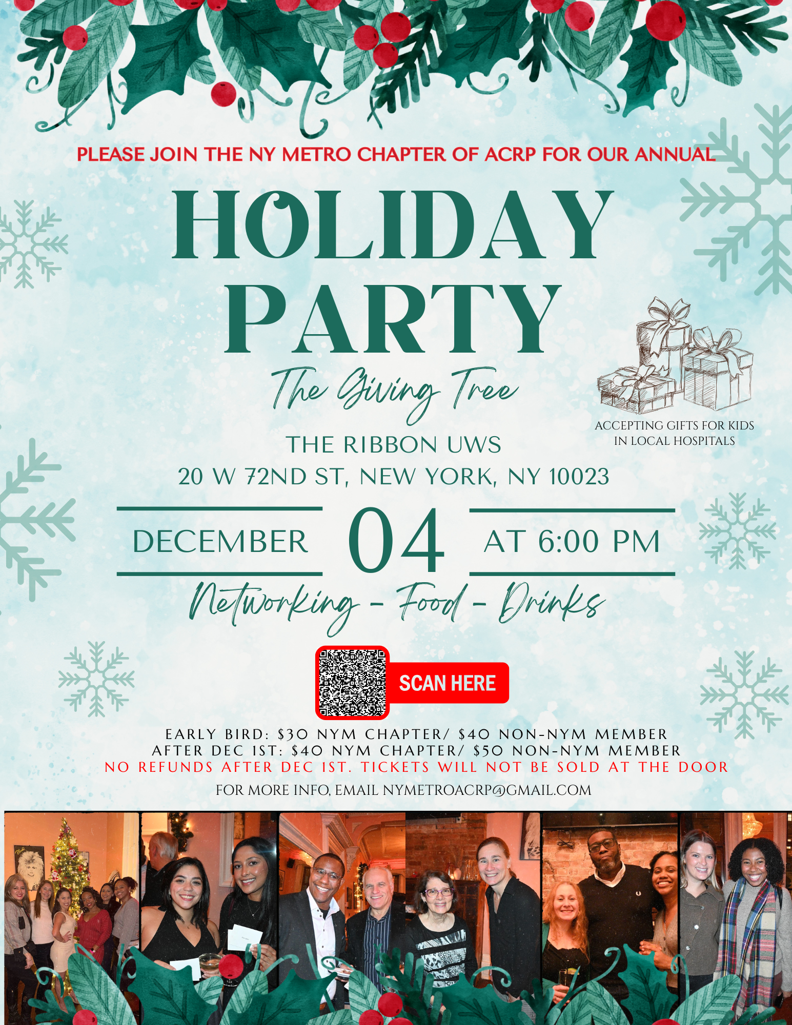 It’s that time of year again—let’s celebrate the season and another successful year in clinical research! Join the NY Metropolitan Chapter of ACRP for our 22nd Annual Holiday Party & Networking Event at The Ribbon – Upper West Side, a cozy yet vibrant spot perfect for unwinding and connecting.